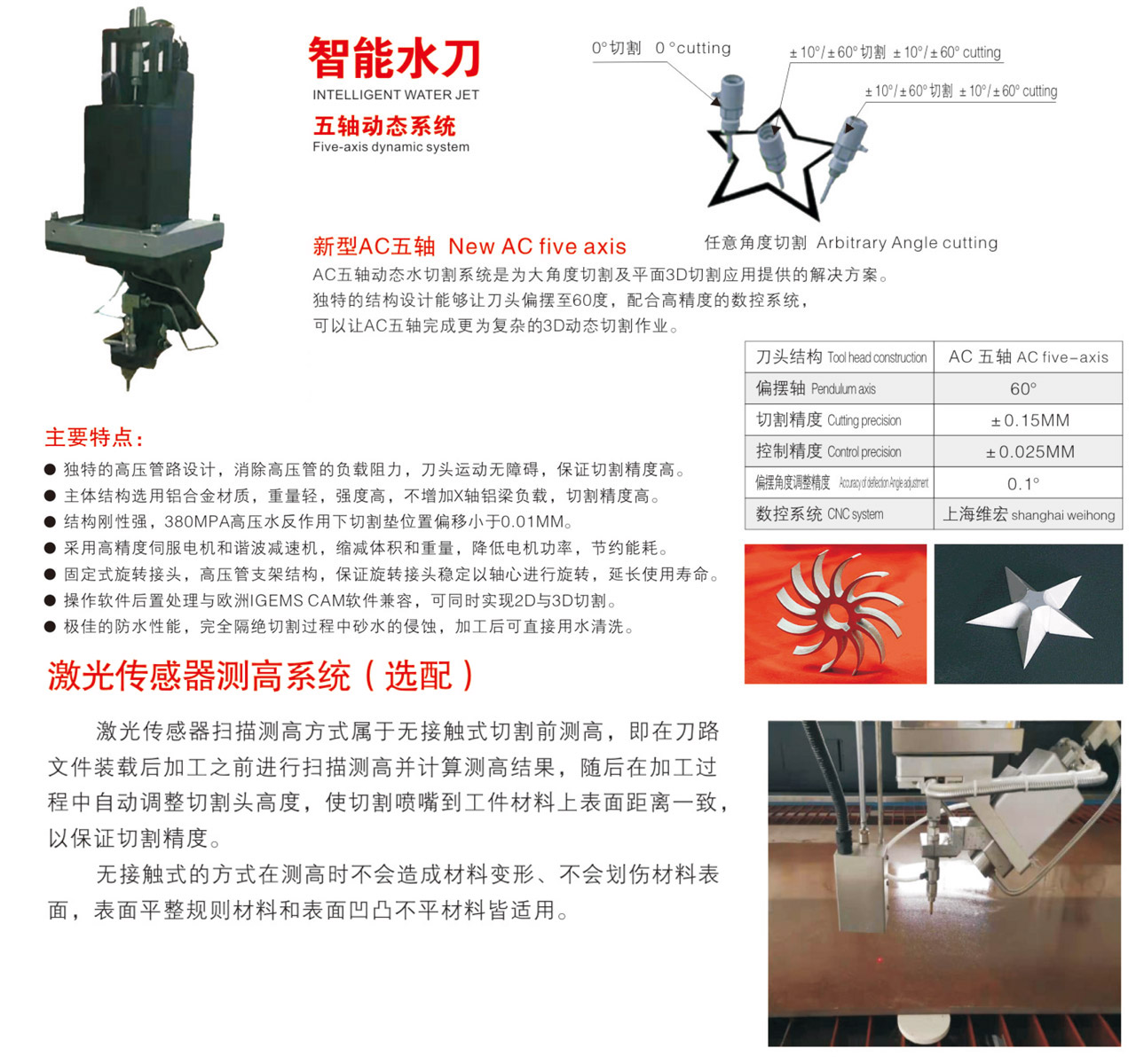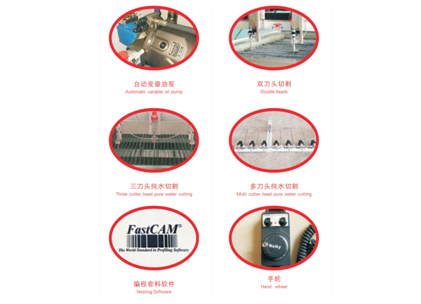 用戶選配 1、翻轉(zhuǎn)臺(tái)面 2、油冷機(jī)阿 3、風(fēng)冷機(jī) 4、軟化水系統(tǒng) 5、精密砂量控制漏砂器 6、無線遙控 7、自動(dòng)變量油泵 8、雙刀頭切割 9、多刀頭純水切割 10、自動(dòng)清砂系統(tǒng) 11、手輪